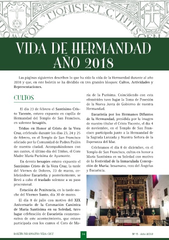 2018 y que, en este boletín se ha dividido en tres grandes bloques: Cultos, Actividades y