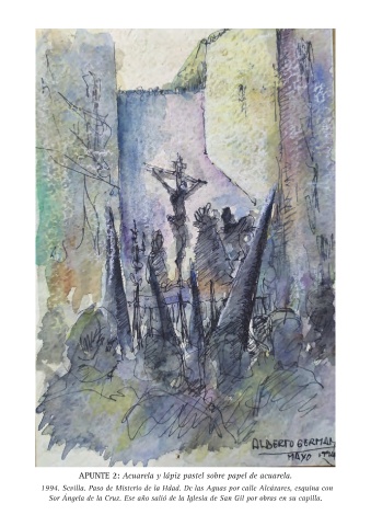 APUNTE 2: Acuarela y lápiz pastel sobre papel de acuarela. 1994. Sevilla. Paso de Misterio de la Hdad. De las Aguas por calle Alcázares, esquina con Sor Ángela de la Cruz. Ese año salió de la Iglesia de San Gil por obras en su capilla.