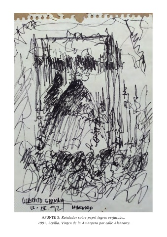 APUNTE 3: Rotulador sobre papel ingres verjurado.. 1991. Sevilla. Virgen de la Amargura por calle Alcázares.