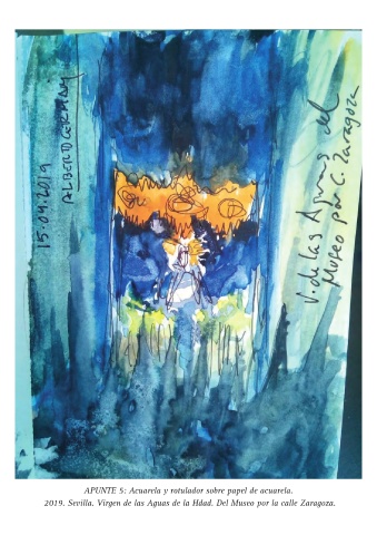 APUNTE 5: Acuarela y rotulador sobre papel de acuarela. 2019. Sevilla. Virgen de las Aguas de la Hdad. Del Museo por la calle Zaragoza.