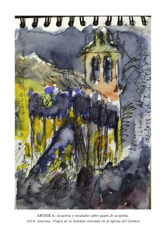 APUNTE 6: Acuarela y rotulador sobre papel de acuarela. 2019. Aracena. Virgen de la Soledad entrando en la Iglesia del Carmen